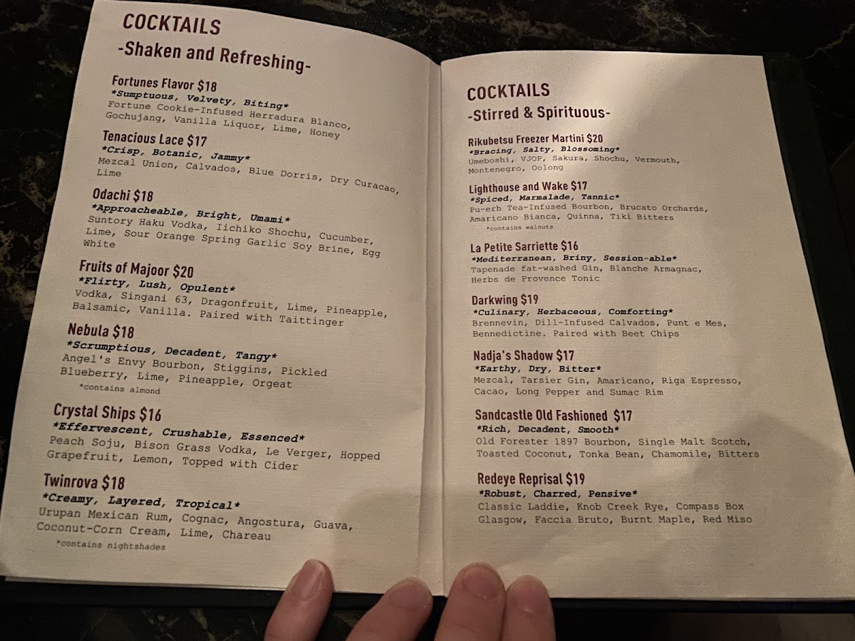 “ This place has the most interesting cocktails I’ve seen on a menu. I wanted one of everything. The place is small and intimate which, I love. Ambiance is great. It is hard to get in at peak times due to this...but keep trying because it’s great. The food looked interesting, but didn’t get to try so we’ll have to comeback. EDIT: Finally tried the food. It’s as amazing as the drinks. A new must stop when in the area. ”